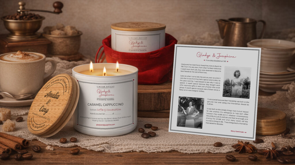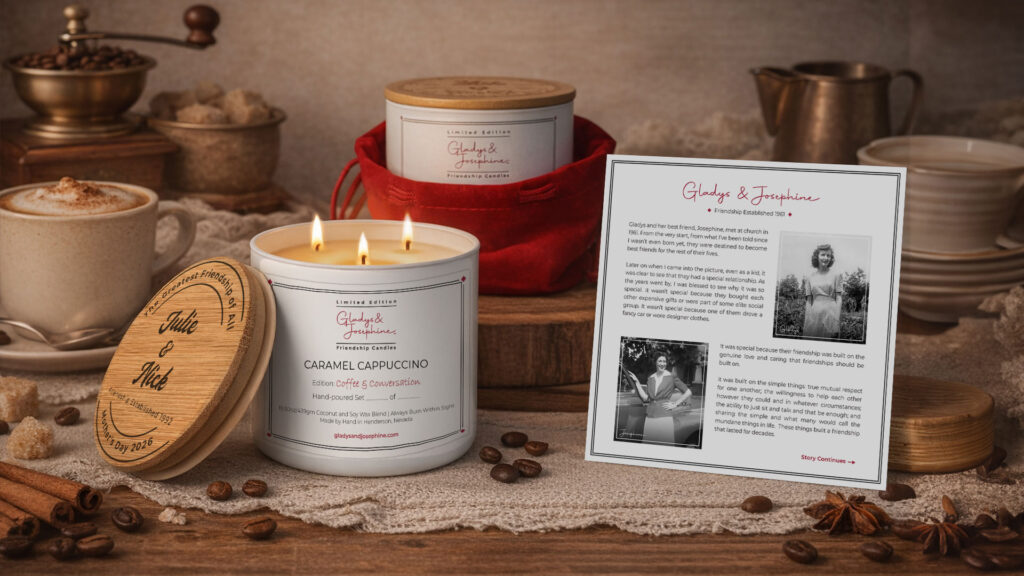 Share the joy of your friendship with matching candles designed to honor your unique bond. Custom engraved with your names and the date your friendship began. A perfect tribute to the connection you share. That’s what makes owning a Gladys and Josephine candle so special!